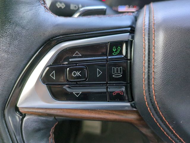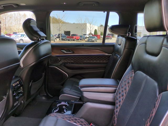 The Optional Features Included on this vehicles are: Luxury Tech Group V (2nd Row Manual Window Shades and Wireless Charging Pad), Quick Order Package 22S, Trailer Tow Group (B) (Trailer Hitch Zoom), Two Tone Paint Group, 10 Speakers, 3.45 Rear Axle Ratio, 3rd row seats: split-bench, 4-Wheel Disc Brakes, ABS brakes, Active Noise Control System, Adaptive suspension, Air Conditioning, Air Susp/Activ Damping Delete Credit, Alloy wheels, AM/FM radio: SiriusXM w/360L, Anti-whiplash front head restraints, Apple CarPlay/Android Auto, Audio memory, Auto High-beam Headlights, Auto-dimming door mirrors, Auto-dimming Rear-View mirror, Auto-leveling suspension, Automatic temperature control, Body Color Roof (DISC), Brake assist, Bumpers: body-color, Compass, Delay-off headlights, Driver door bin, Driver vanity mirror, Dual front impact airbags, Dual front side impact airbags, Electronic Stability Control, Emergency communication system, Four wheel independent suspension, Front anti-roll bar, Front Bucket Seats, Front Center Armrest w/Storage, Front dual zone A/C, Front fog lights, Front License Plate Bracket (DISC), Front reading lights, Fully automatic headlights, Garage door transmitter, Genuine wood dashboard insert, Genuine wood door panel insert, Heated door mirrors, Heated front seats, Heated rear seats, Heated steering wheel, Illuminated entry, Knee airbag, Leather steering wheel, Low tire pressure warning, Memory seat, Nappa Leather Seats, Navigation System, Normal Duty Suspension, Occupant sensing airbag, Outside temperature display, Overhead airbag, Overhead console, Panic alarm, Passenger door bin, Passenger vanity mirror, Power door mirrors, Power driver seat, Power Fold Seatbacks, Power Liftgate, Power moonroof: CommandView, Power passenger seat, Power steering, Power windows, Radio data system, Radio: Uconnect 5 Nav w/10.1" Display, Rain sensing wipers, Rear air conditioning, Rear anti-roll bar, Rear dual zone A/C, Rear reading lights, Rear seat center armrest, Rear window defroster, Rear window wiper, Reclining 3rd row seat, Remote keyless entry, Roof rack: rails only, Security system, Speed control, Speed-Sensitive Wipers, Split folding rear seat, Spoiler, Steering wheel memory, Steering wheel mounted audio controls, Tachometer, Telescoping steering wheel, Tilt steering wheel, Traction control, Trip computer, Turn signal indicator mirrors, Variably intermittent wipers, Ventilated front seats, Voltmeter, and Wheels: 20" x 8.5" Fully Polished Aluminum.