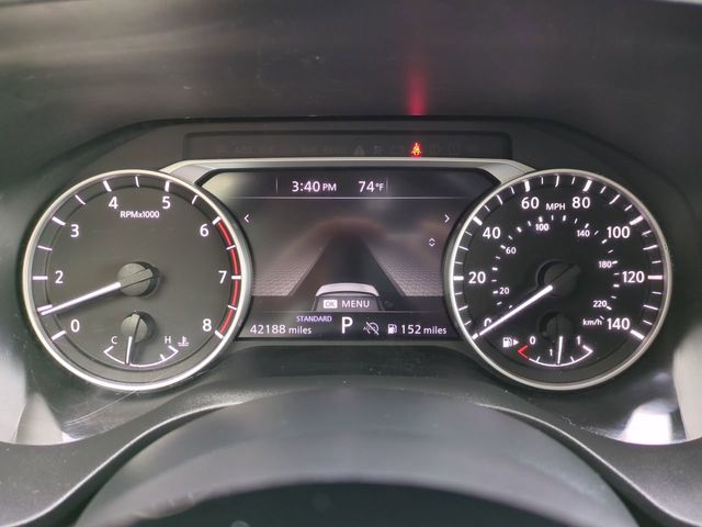 The Optional Features Included on this vehicles are: 19" Aluminum Alloy Wheels, 4-Wheel Disc Brakes, 5.604 Axle Ratio, 6 Speakers, ABS brakes, Air Conditioning, Alloy wheels, AM/FM Radio, AM/FM radio: SiriusXM, Auto High-beam Headlights, Auto-dimming Rear-View mirror, Automatic temperature control, Brake assist, Bumpers: body-color, Delay-off headlights, Driver door bin, Driver vanity mirror, Dual front impact airbags, Dual front side impact airbags, Electronic Stability Control, Emergency communication system: NissanConnect Services, First Aid Kit, Floor Mats w/2-Piece Cargo Area Protector, Four wheel independent suspension, Front anti-roll bar, Front Bucket Seats, Front Center Armrest, Front dual zone A/C, Front reading lights, Fully automatic headlights, Heated door mirrors, Heated Front Bucket Seats, Heated front seats, Heated steering wheel, Illuminated entry, Knee airbag, Leather steering wheel, Leather-Appointed Seat Trim, Low tire pressure warning, Memory seat, NissanConnect featuring Apple CarPlay and Android Auto, Occupant sensing airbag, Outside temperature display, Overhead airbag, Overhead console, Panic alarm, Passenger door bin, Passenger vanity mirror, Power door mirrors, Power driver seat, Power Liftgate, Power moonroof, Power passenger seat, Power steering, Power windows, Radio data system, Rear anti-roll bar, Rear Parking Sensors, Rear reading lights, Rear seat center armrest, Rear side impact airbag, Rear window defroster, Rear window wiper, Remote keyless entry, Security system, Speed control, Speed-Sensitive Wipers, Split folding rear seat, Spoiler, Steering wheel mounted audio controls, Tachometer, Telescoping steering wheel, Tilt steering wheel, Traction control, Trip computer, Turn signal indicator mirrors, and Variably intermittent wipers.